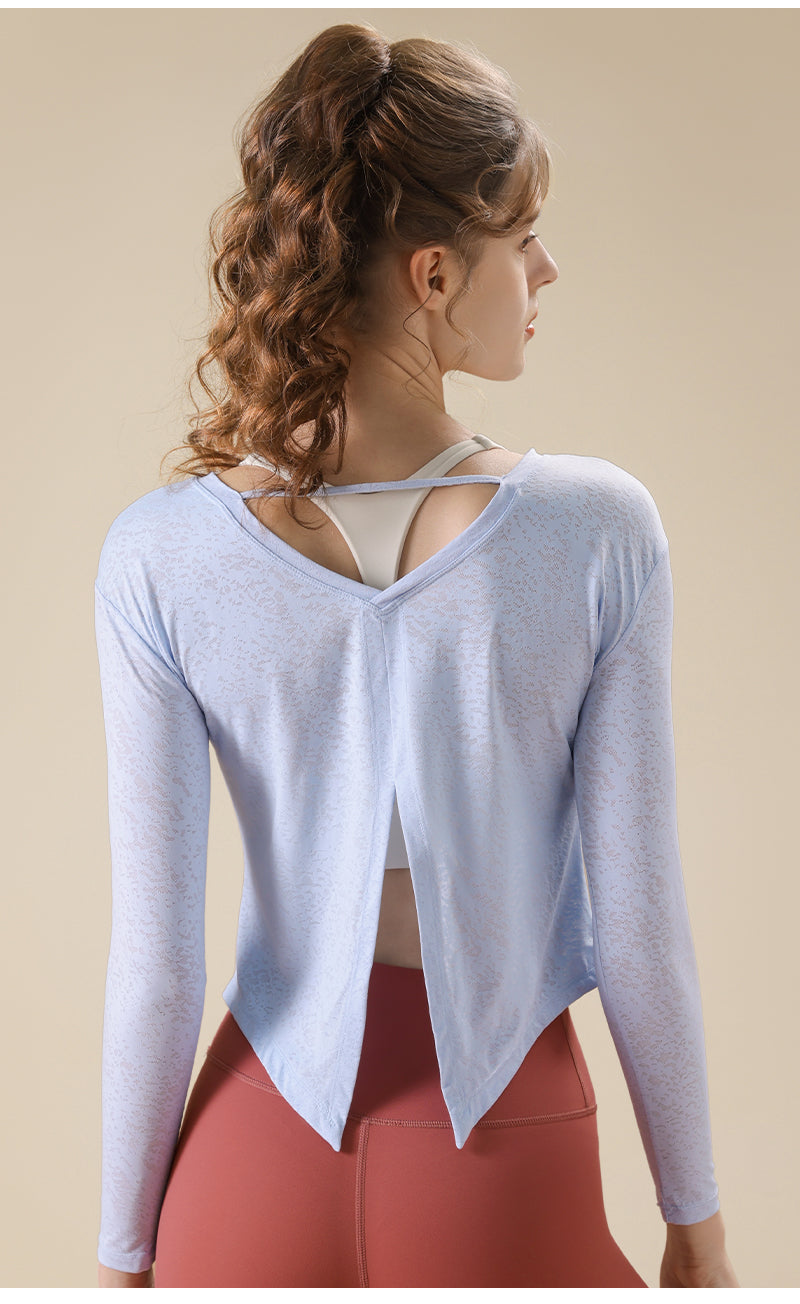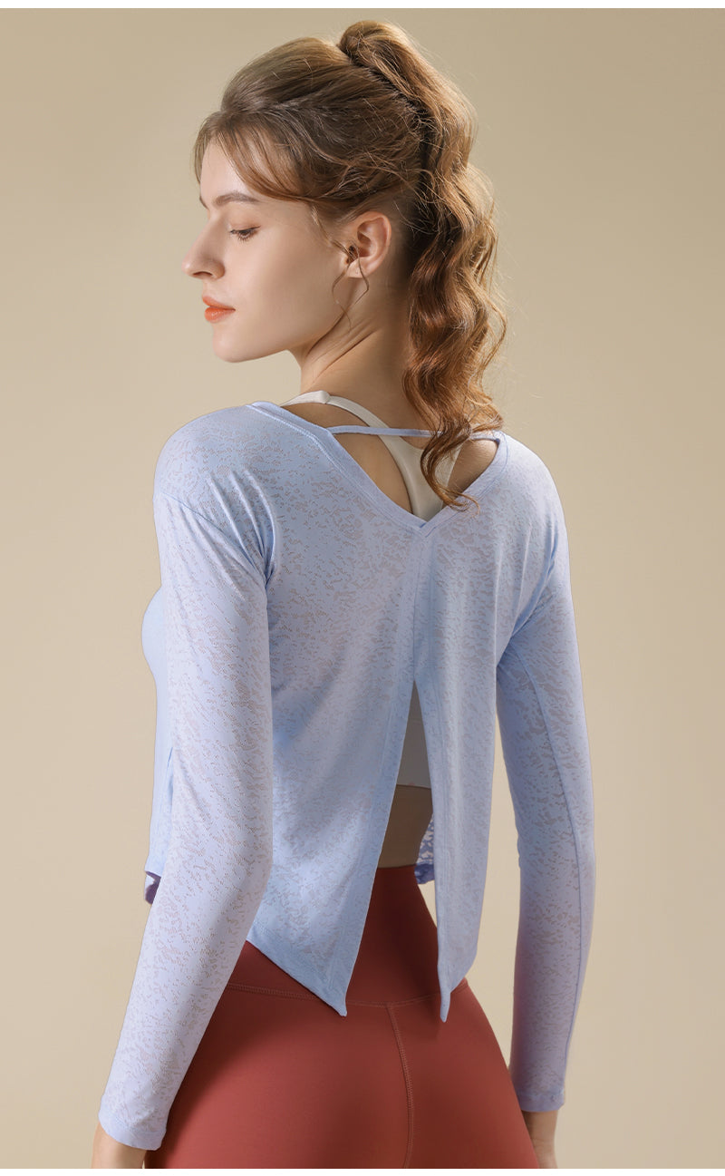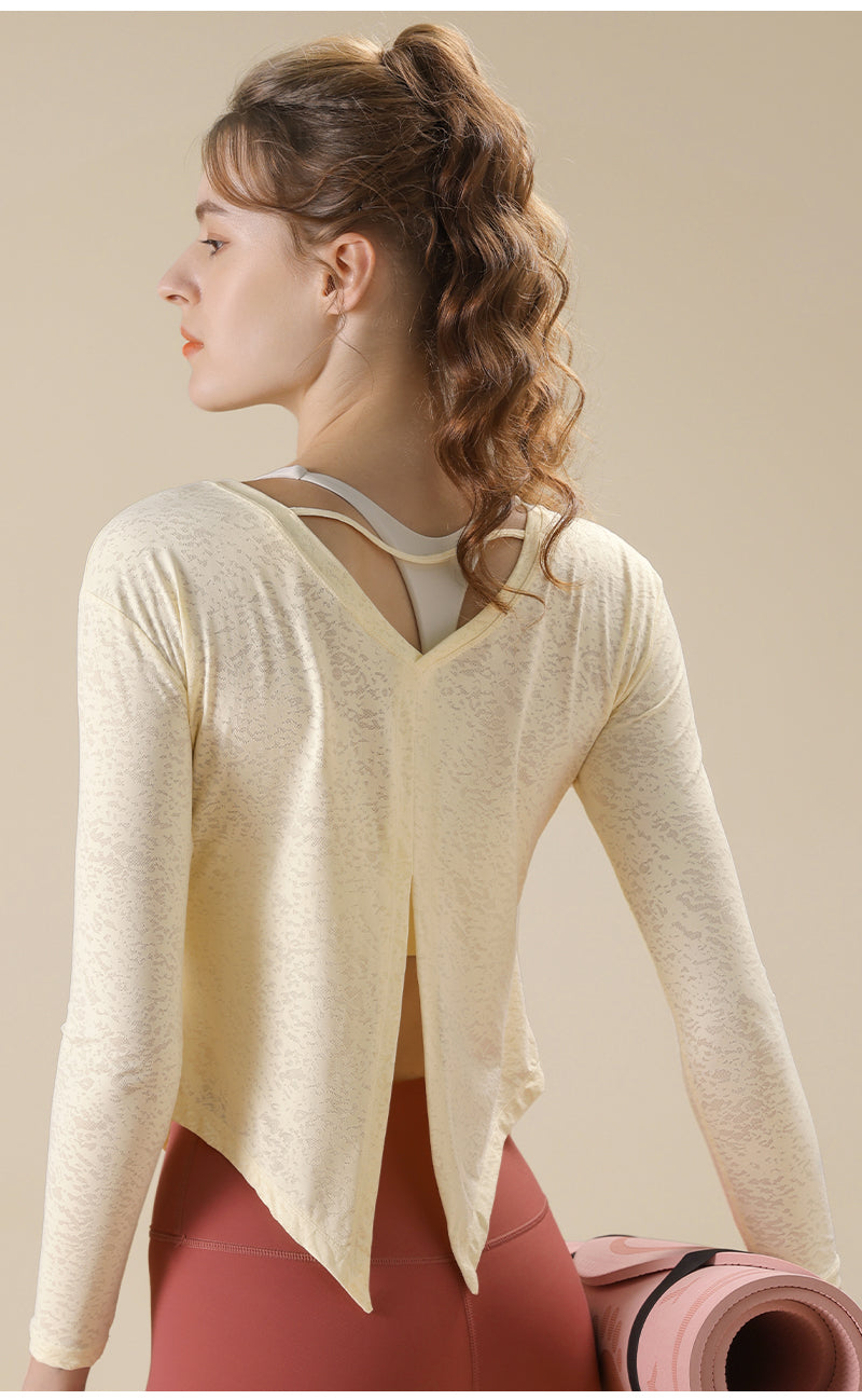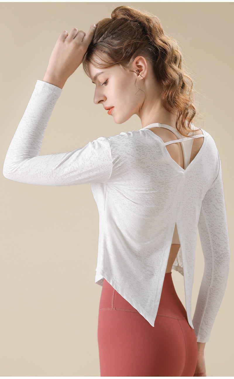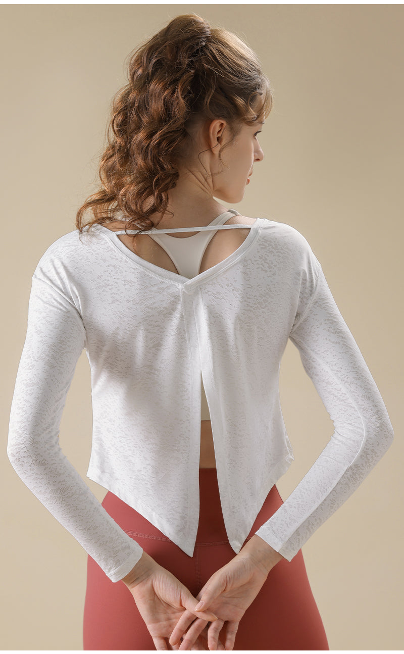 The open-back design adds freedom in layering and movement, creating a natural drape with every pose.